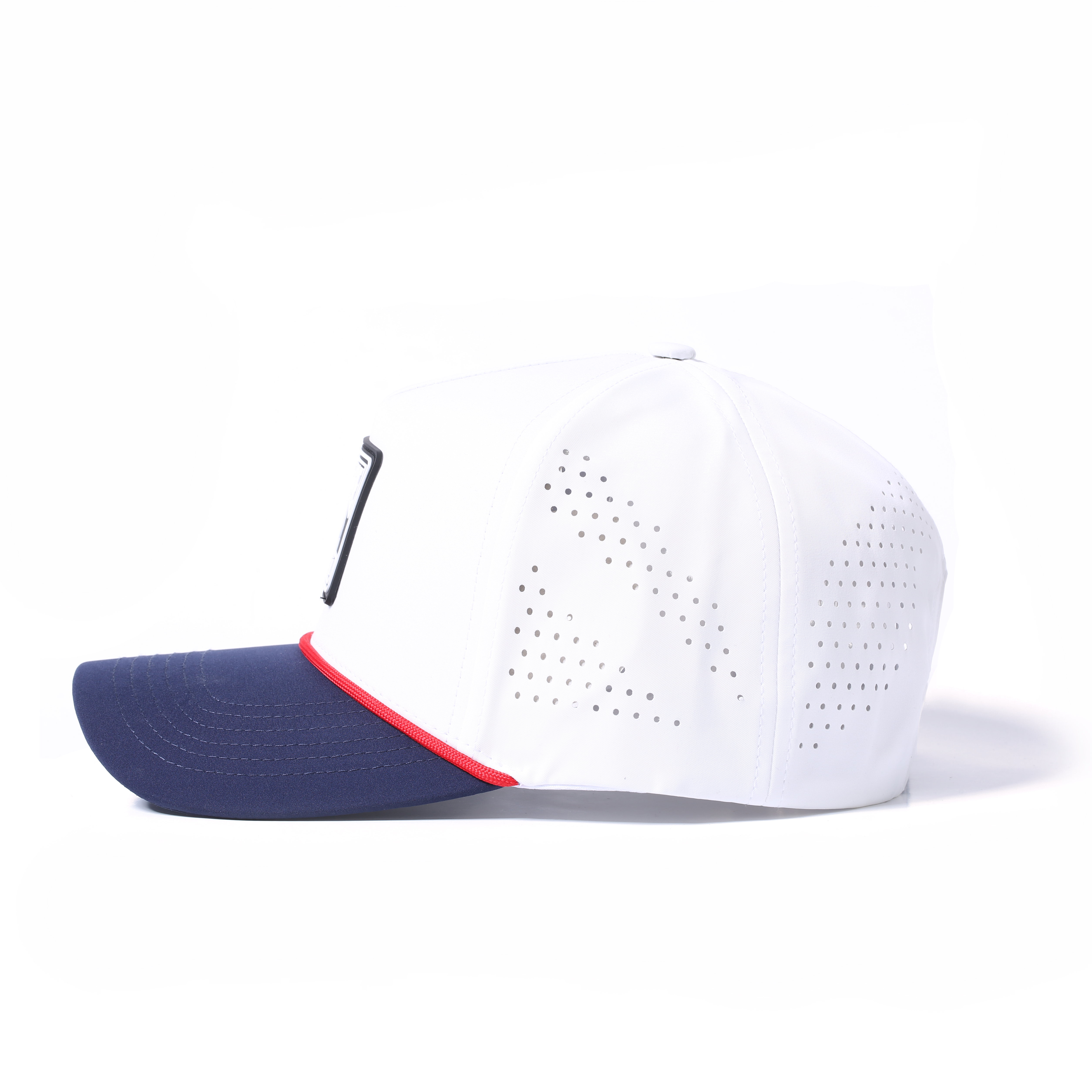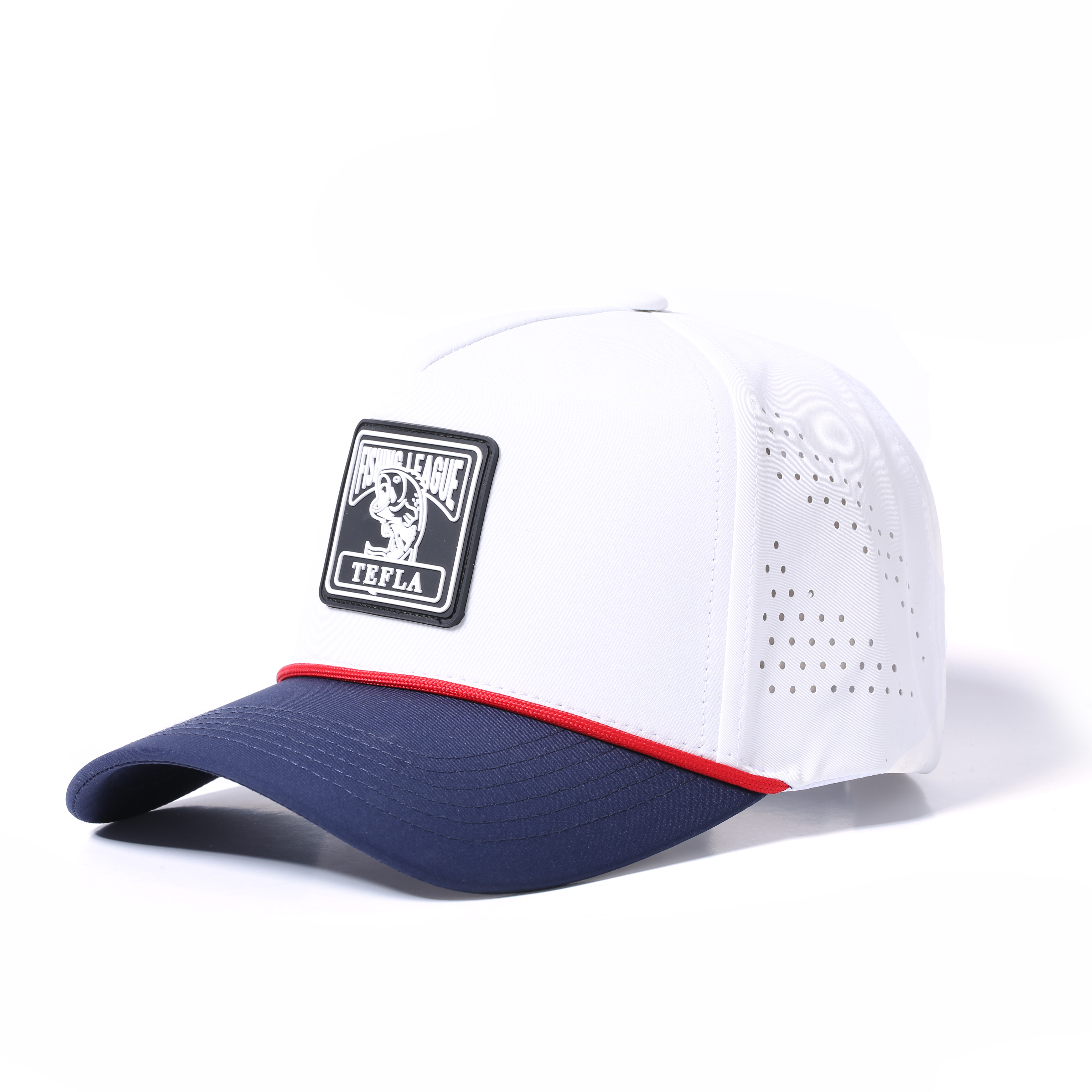 Эта изготовленная на заказ кепка для гольфа с резиновыми вставками выполнена в классической бело-темно-синей цветовой гамме и демонстрирует чистый и современный дизайн. Переднюю часть кепки украшает уникальный резиновый патч-логотип. Яркий и характерный дизайн подчеркивает спортивный вид кепки и узнаваемость бренда. Темно-синие поля подчеркнуты красной декоративной полосой по краю, добавляя яркости и стиля.
